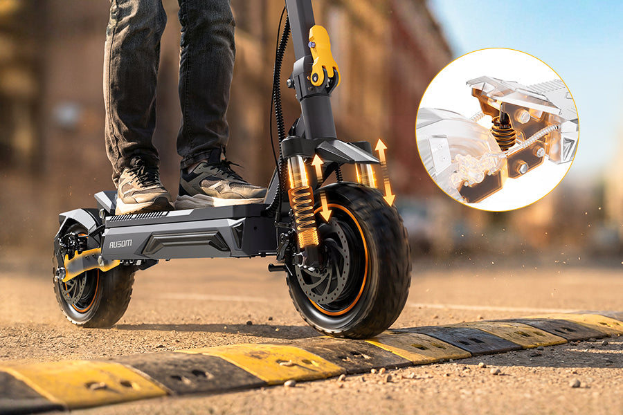 Front suspension fork and rear swingarm with adjustable spring soak up vibration from potholes, cracks, and uneven surfaces. Enjoy superior stability, reduced vibration, and fatigue-free rides on your long-range electric scooter—arrive refreshed after bumpy city streets.