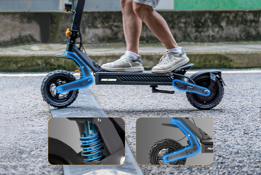 Patented dual swingarm suspension with adjustable springs absorbs bumps for a stable, comfortable ride. Say goodbye to wobbling on your commutes or errands, and glide smoothly over any urban terrain.